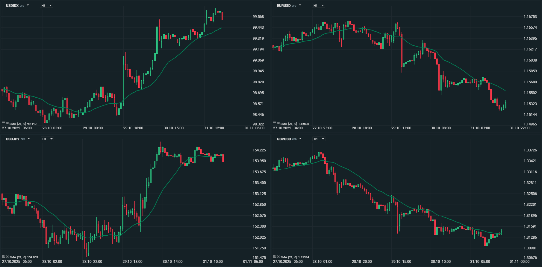 No mês de Outubro, a divisa que mais perdas acumulou foi o iene japonês, que perdeu cerca de 4,5% face ao dólar, de 146,60 até 154,45, 3,7% face ao franco suíço (de 184,00 até 192,70) e 3% face ao euro (172,26 até 178,82). O dólar foi a moeda que mais ganhou, com o índice DXY a ganhar cerca de 2% em Outubro.