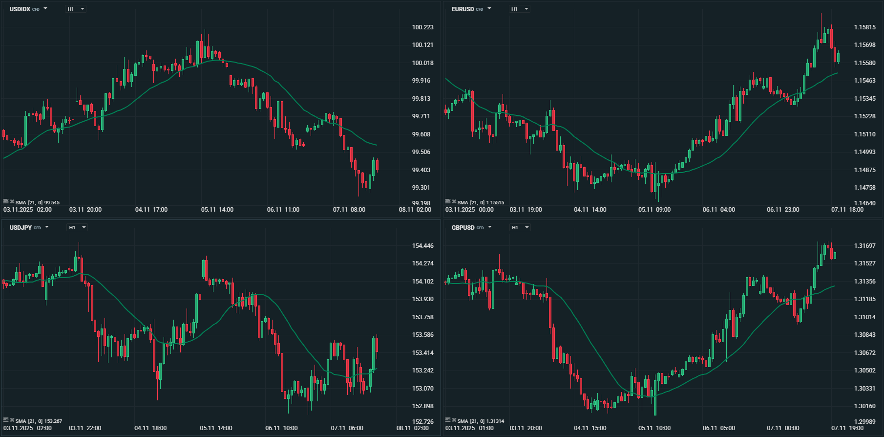 O índice DXY, após iniciar a semana a negociar a 99,65, registou um novo máximo, ultrapassando a marca dos 100 (100,21), atingindo a média móvel dos 200 dias pela primeira vez desde Março deste ano. Terminou a recuar desses máximos, negociando a 99,40.