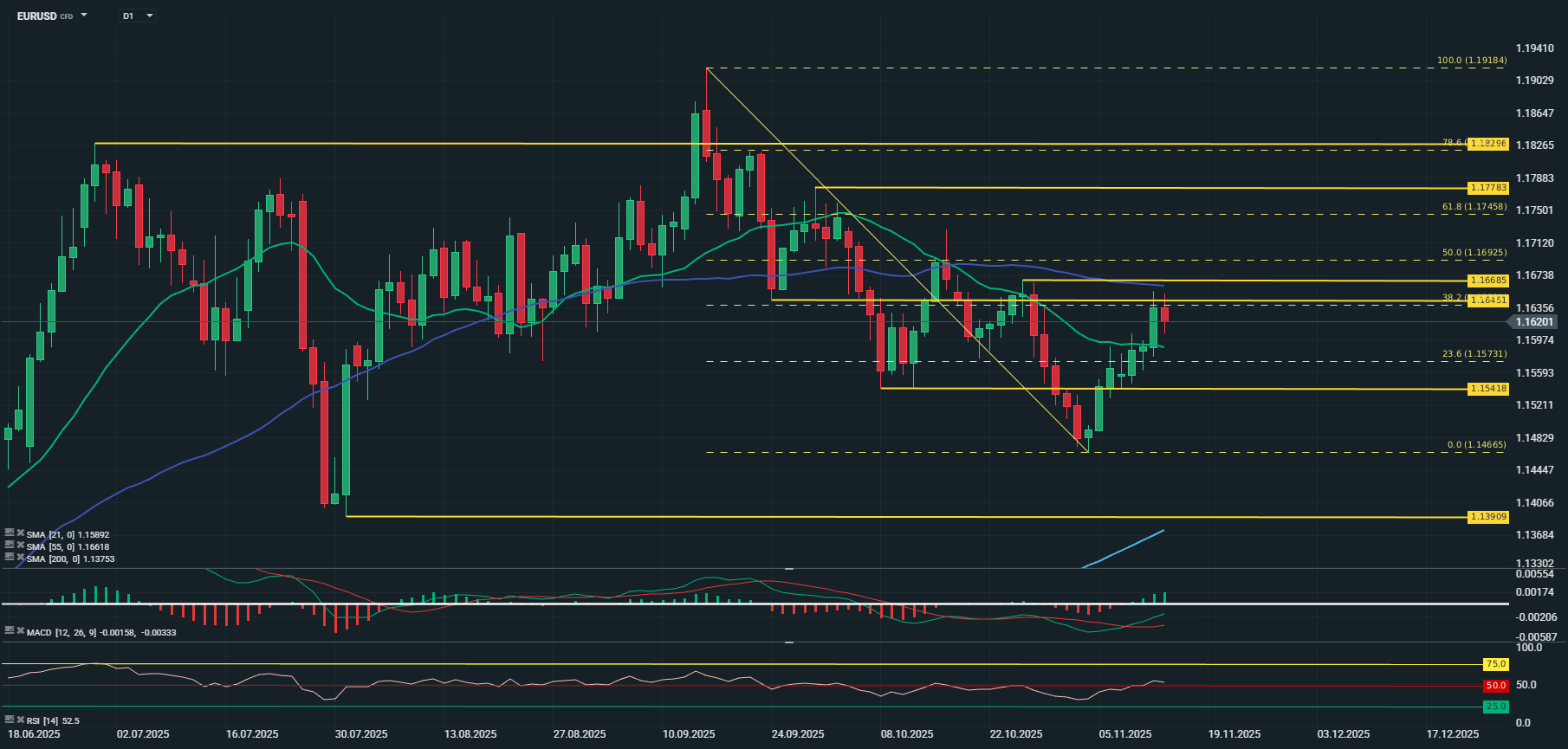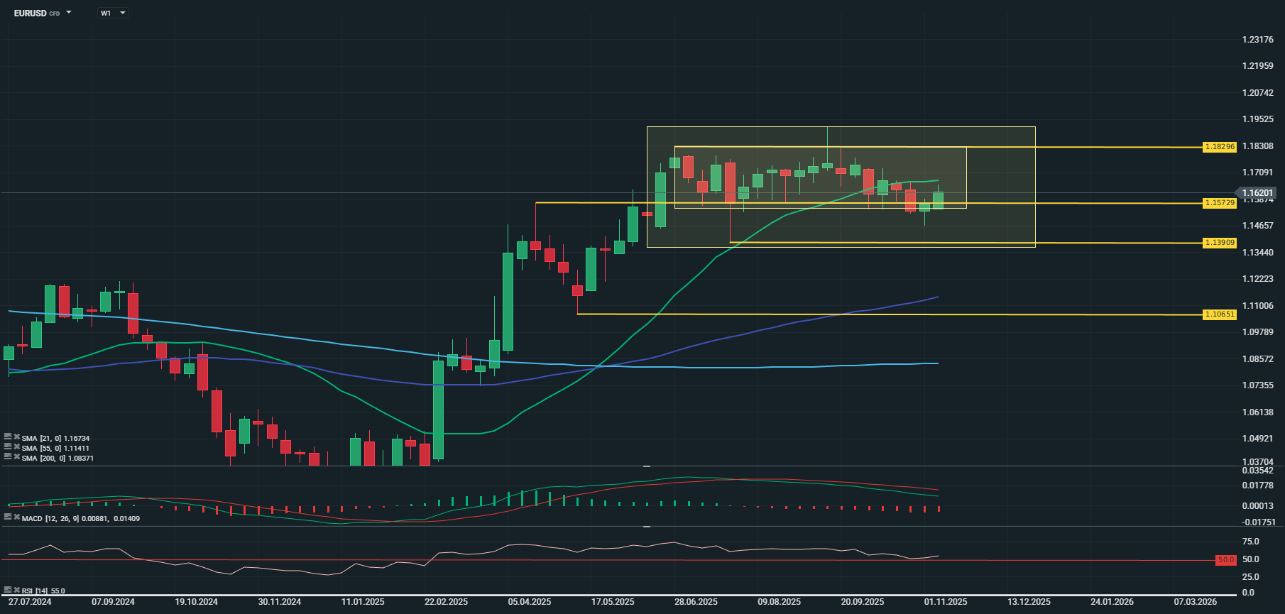 A volatilidade permaneceu baixa, embora tenhamos assistido a algum arrefecimento dos ganhos recentes do dólar, que voltou a negociar em terreno negativo ao longo da semana. Esse movimento deu algum suporte ao EUR/USD, que, apesar de continuar preso a um intervalo estreito, encerrou a semana em ligeira alta. Do lado dos dados, a única novidade foi o relatório semanal da ADP, que voltou a evidenciar fragilidade no mercado laboral norte-americano, com uma perda média de 11.250 postos de trabalho nas quatro semanas até 25 de Outubro.
