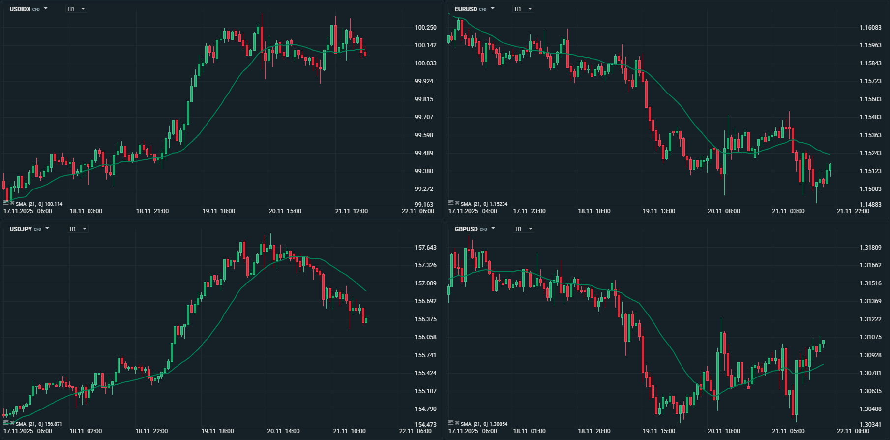 Esta semana o mercado cambial evidenciou um ambiente particularmente sensível a mudanças de narrativa, amplificado pelas divisões internas na Reserva Federal quanto ao futuro das taxas de juro. A oscilação abrupta nas expectativas de um corte em Dezembro mostrou como o mercado continua dependente de cada nuance da Fed. Ao mesmo tempo, a divergência económica entre regiões tornou-se mais clara: os EUA mantêm uma resiliência que contrasta com a estagnação da Zona Euro e com as fragilidades estruturais do Reino Unido, sustentando a força do dólar num horizonte mais longo. O franco suíço reforçou o seu estatuto de porto seguro, apoiado por fundamentos sólidos, enquanto as moedas emergentes e ligadas a matérias-primas permaneceram expostas ao abrandamento da economia chinesa. Com menos dados económicos disponíveis até à reunião de dezembro da Fed, os investidores terão de navegar um período de incerteza acrescida, onde cada sinal poderá desencadear movimentos significativos nos principais pares cambiais.