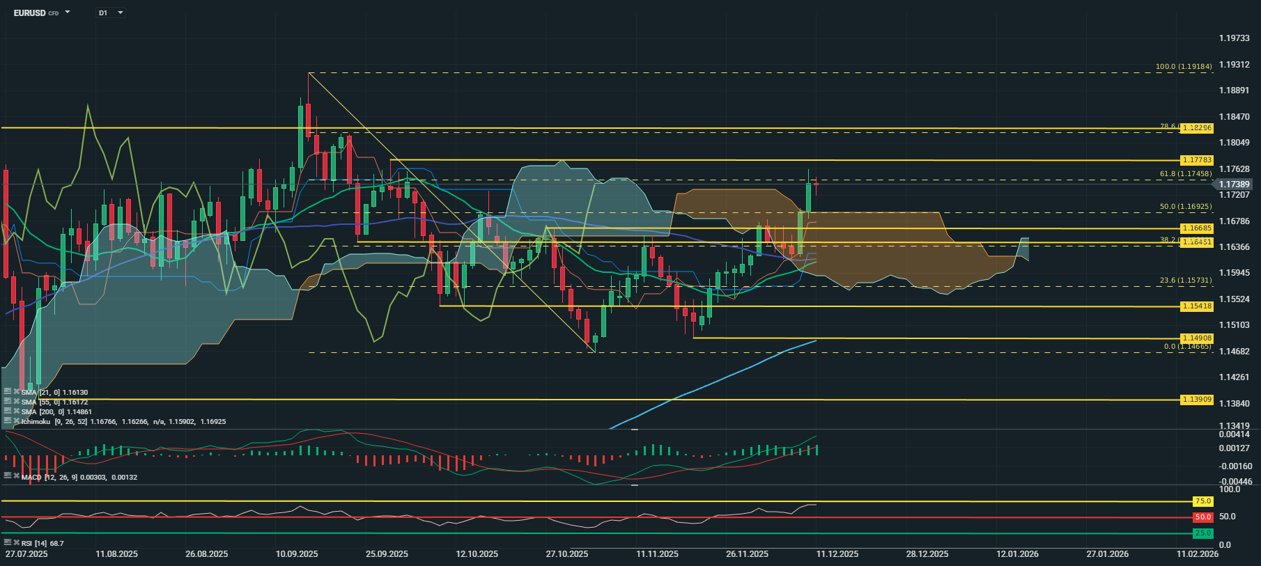 O EUR/USD atingiu os 61,8% Fibonacci Retracement do movimento máximo do ano / mínimo de Novembro a 1,1746, tendo registado um máximo de 1,1762, antes de terminar a semana a 1,1739.