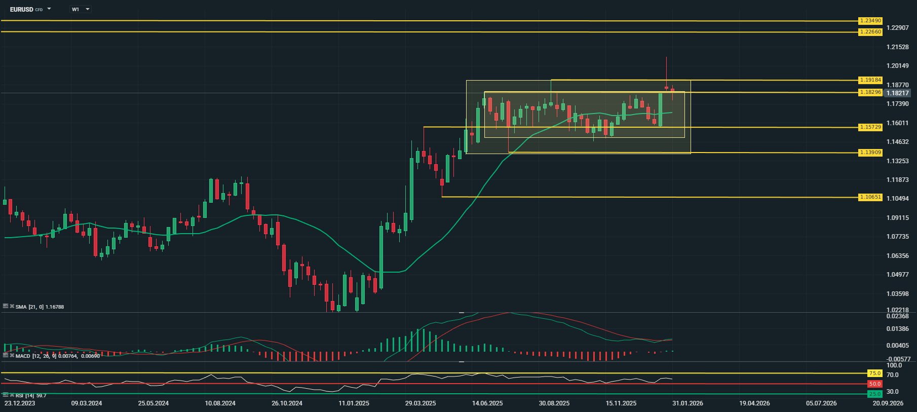 O break do máximo da semana anterior a 1,1822 e da resistência a 1,1830, poderá confirmar a retoma da tendência ascendente e dar força ao par para um novo teste a 1,1918 (máximo deste ano), confirmando simultaneamente o break da área de consolidação da última metade de 2025, e a possibilidade de poder voltar a negociar acima de 1,2000, com os olhos postos no novo máximo deste ano a 1,2082.