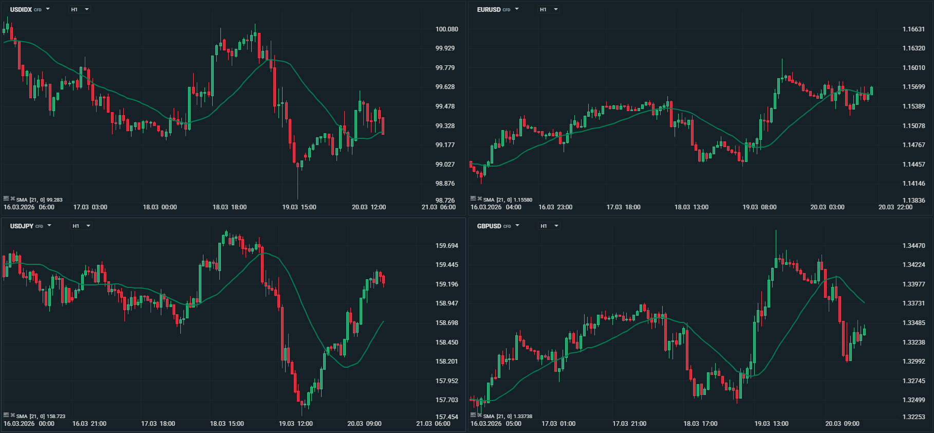 No início, o dólar continuou a beneficiar do estatuto de moeda de refúgio, com o conflito no Irão, petróleo acima dos 100 dólares. A reunião da Fed, que manteve taxas, e o tom cauteloso de Powell reforçaram ligeiramente o dólar, que acabou por registar uma queda mais forte na quinta-feira: o DXY caiu de 100,15 para mínimos abaixo de 99,00. Um ligeiro alívio nas yields, no sentimento de risco e um recuo temporário nos preços do petróleo, levaram a uma reacção de “profit taking”, pesando sobre o dólar. Ainda assim, a semana terminou com o DXY a recuperar do mínimo atingido a 98,75.