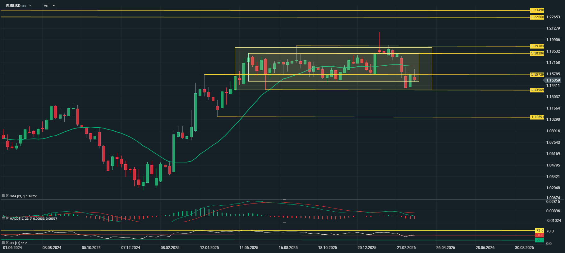 Com o suporte a 1,1391 a parar a queda do par, poderemos ver o EUR/USD a continuar dentro da área de consolidação entre 1,1400 e 1,1900, que vem a registar desde Junho de 2025. Pelo meio o par terá a resistência dada pela MM das 21 semanas, de momento a 1,1675.