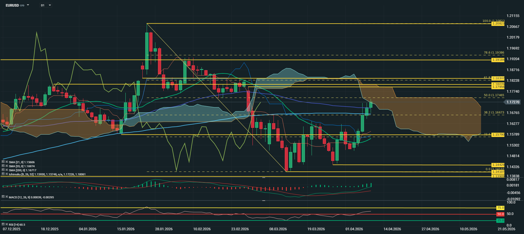 Apesar da reacção efusiva com o anúncio do cessar-fogo e das conversações entre os Estados Unidos e o Irão, a situação continua muito frágil. Uma escalada no conflito irá certamente voltar a pressionar o EUR/USD, enquanto notícias animadoras relativamente a um acordo poderão impulsioná-lo.