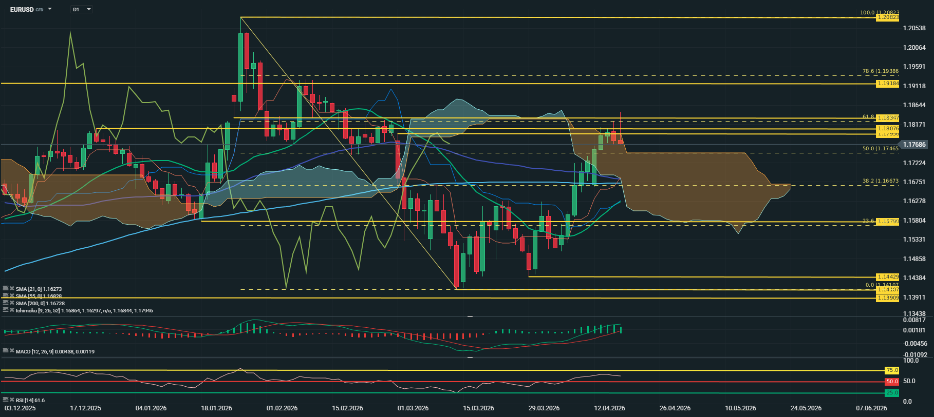 O break da área 1,1795/1,1848, dado pelo actual nível de Senkou B e do máximo da semana passada, manterá o preço na forte tendência ascendente que tem mostrado desde finais de Março, com a próxima resistência a encontrar-se a 1,1918, máximo de Setembro de 2025, que se ultrapassada, irá expor o nível psicológico 1,2000, antes do máximo deste ano a 1,2082.