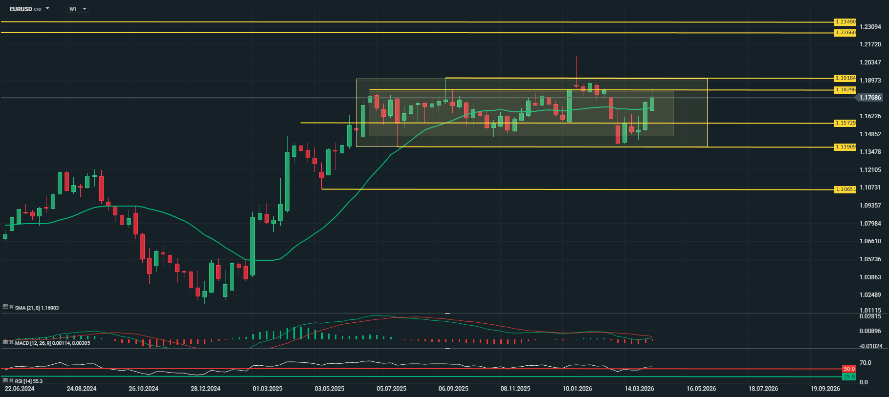 Na semana passada o EUR/USD voltou a negociar na tendência ascendente das últimas duas semanas, mantendo-se acima da média móvel das 21 semanas, mas continuando a manter-se dentro do padrão de consolidação 1,1480/1,1530 dos últimos meses.