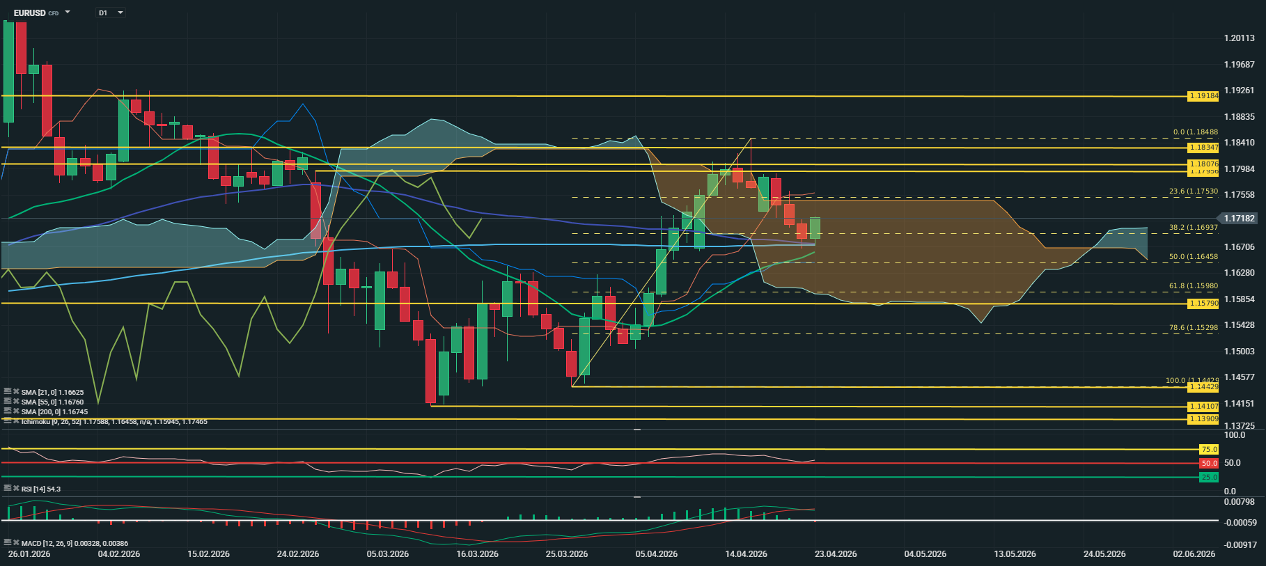 O EUR/USD, após na semana anterior ter registado um máximo de mais de dois meses, entrou em correcção e negociou em correcção, testando o agora suporte dado pela média móvel dos 200 dias, mantendo-se dentro da Nuvem de Ichimoku diária.